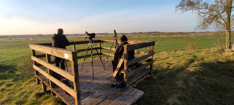 Tre förväntansfulla törebodaskådare traskade ut till plattformen med de första solstrålarna glödandes precis under horisonten. Det var nästan vindstilla och sikten fantastisk. Det var mycket vadare och som vanligt mycket änder. Bland det mer intressanta kan nämnas svartsnäppa, gravand och årta. Men även snygga stjärtänder och plåliga brushanar. Ett par skräntärnor flög in över våtmarken och en flock ljungpipare drog runt i fjärran. Vi hade det trevligt och alla tre bidrog till att vi fick se många olika fåglar. Framåt förmiddagen blev det en hel del värmedaller och det blev svårt att få ut så mycket vettigt av själva sjön, men det fyllde på med en del rovfågel och tättingar. Vid elvatiden bröt vi upp på grund av andra åtaganden.